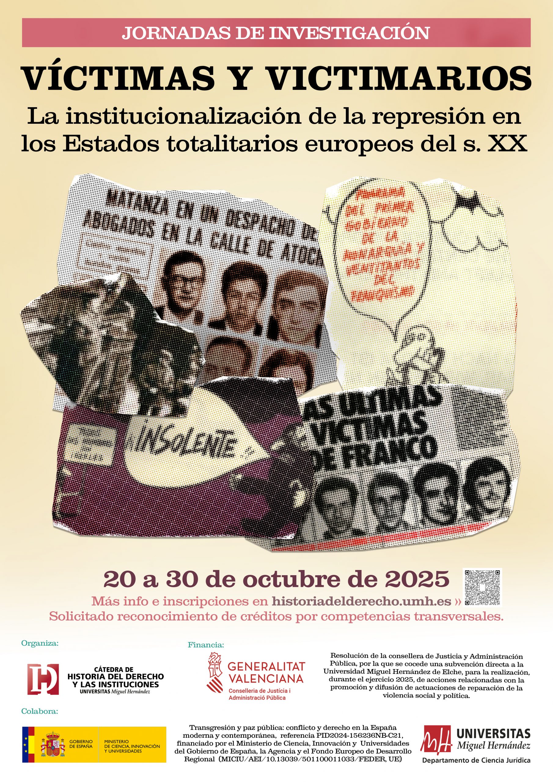 El Área de Historia del Derecho y de las Instituciones de la Universidad Miguel Hernández ha organizado las “Jornadas de investigación: Víctimas y victimarios. La institucionalización de la represión en los Estados totalitarios europeos del s. XX”. Esta actividad está dirigida a reflexionar de forma crítica sobre las consecuencias devastadoras que la intransigencia y la radicalización ideológica han tenido históricamente en la vida de la ciudadanía.